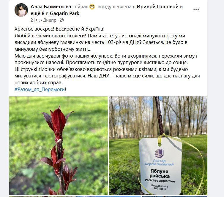 В парке Гагарина растут маленькие яблоневые деревья, которые в прошлом году посадили сотрудники ДНУ. Об этом рассказала доцент кафедры массовых и международных коммуникаций ДНУ им. Олеся Гончара Алла Бахметьева.