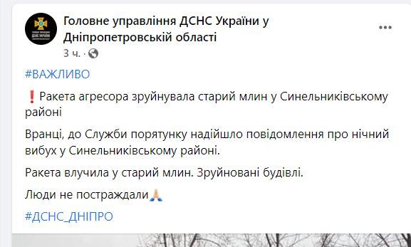 Сегодня ночью вражеская ракета прилетела в Синельниковский район.