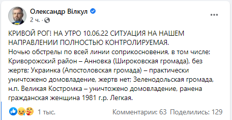 "Ночью обстрелы по всей линии соприкосновения, в том числе: Криворожский район – Анновка (Широковская громада), без жертв; Украинка (Апостоловская громада) – практически уничтожено домовладение, жертв нет; Зеленодольская громада, н. п. Великая Костромка – уничтожено домовладение, ранена гражданская женщина 1981 г. р. Легкая", - сообщил Александр Вилкул.