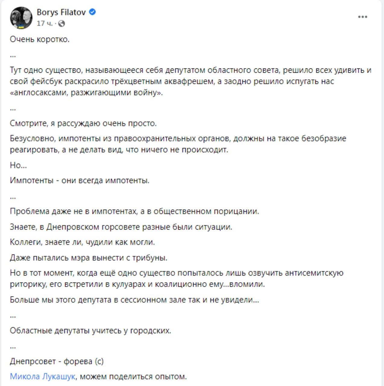 Эту ситуацию прокомментировал на своей странице в Фб мэр Днепра Борис Филатов. Он отметил, что в городском совете на подобные выходки депутатов реагируют быстро, поэтому посоветовал и в областном совете разобраться с Хоришко.