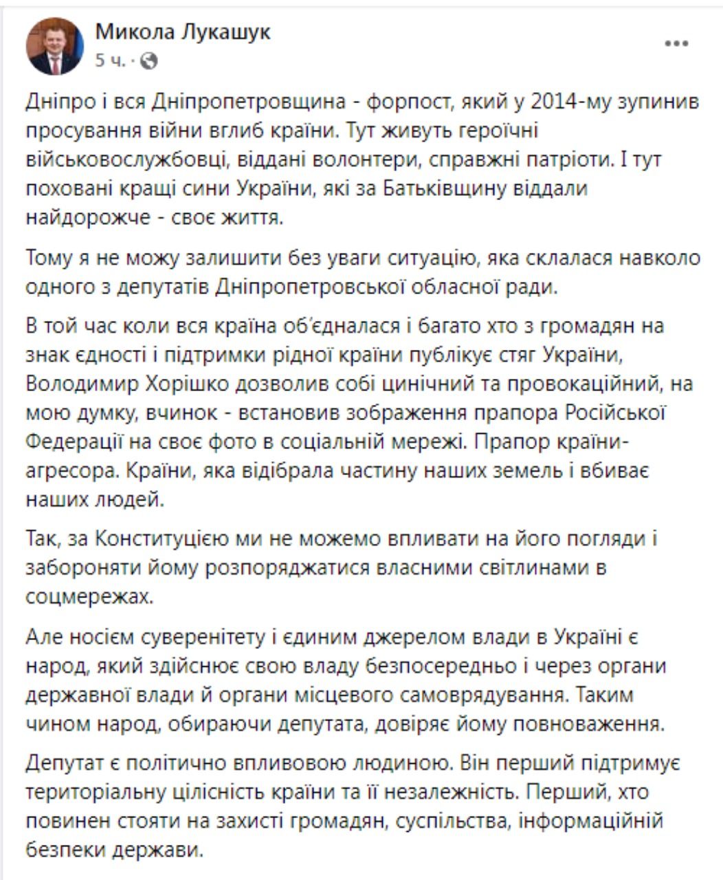 Депутат Днепровского областного совета от ОПЗЖ Владимир Хоришко поставил на аватарку в Facebook флаг страны-агрессора.