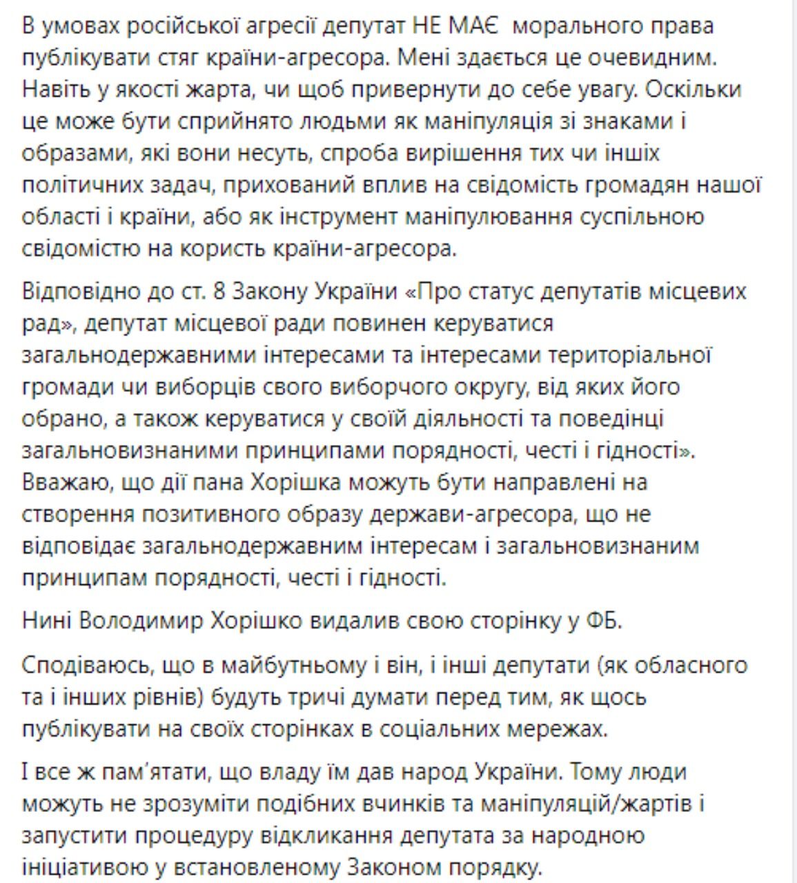 Но отличился депутат облсовета Владимир Хоришко, поставив на аватарку флаг РФ и написав, что он «за дружбу и партнёрство с Россией».