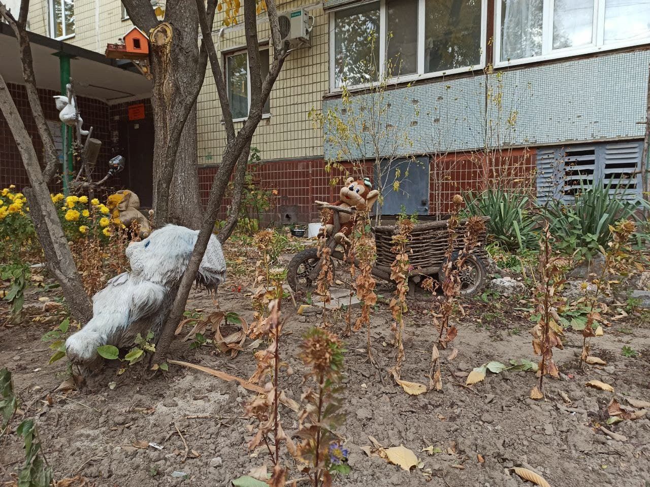 В Днепре на Победе жильцы решили украсить двор старыми детскими игрушками.