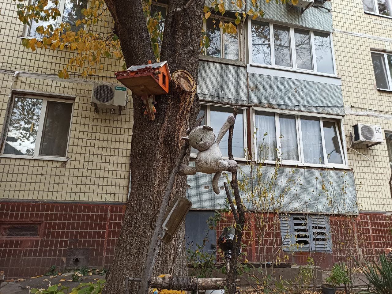 "Распятый" на дереве кот и мишка-водитель: в Днепре жильцы украсили двор старыми игрушками