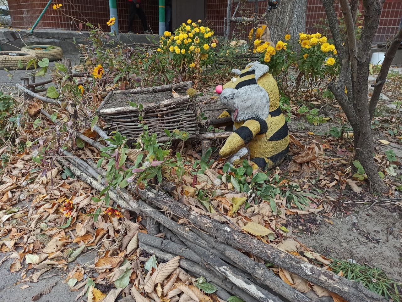 Идея не новая, жильцы часто пытаются украсить свои дворы подручными средствами. Жители же дома на Набережной Победы, 130 решили "поселить" перед подъездом старые плюшевые игрушки. Скорей всего, оставили их тут давно, потому что ткань на них уже посерела от дождей и пыли.