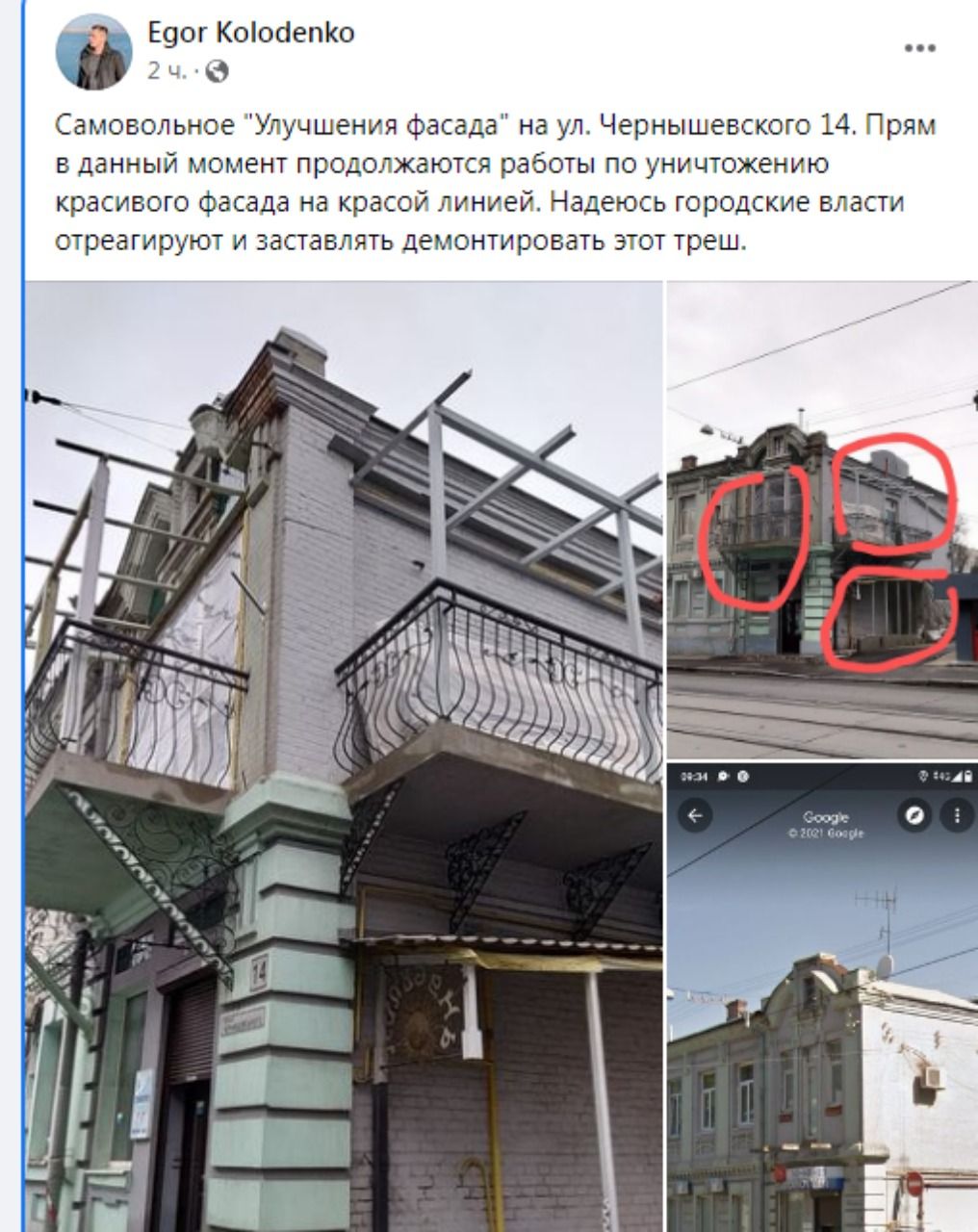 Мужчина сообщает, что продолжается самовольное "улучшение фасада" двухэтажного дома №14, что неподалеку от "Нагорки". Таким образом уничтожается красивый фасад исторического здания. Мужчина надеется, что городская власть отреагирует на это безобразие.