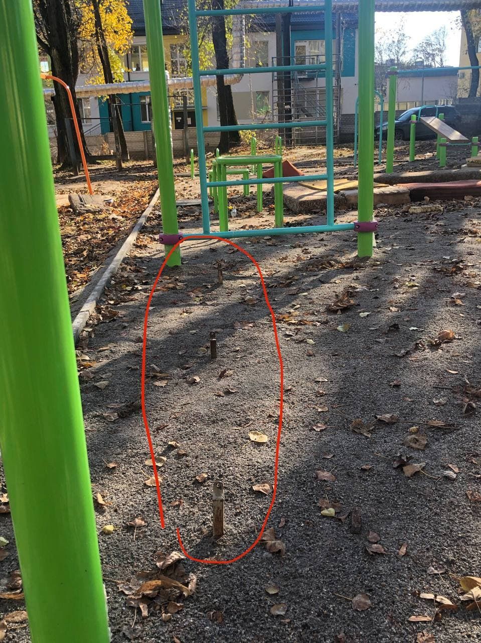 По словам местных жителей, сначала работы на детской площадке шли быстрыми темпами, а потом замедлились, пока вовсе не прекратились. Территория детской площадки сейчас выглядит довольно опасно. Здесь лежат разбросанные камни, целлофан, а из земли торчат металлические штыри.