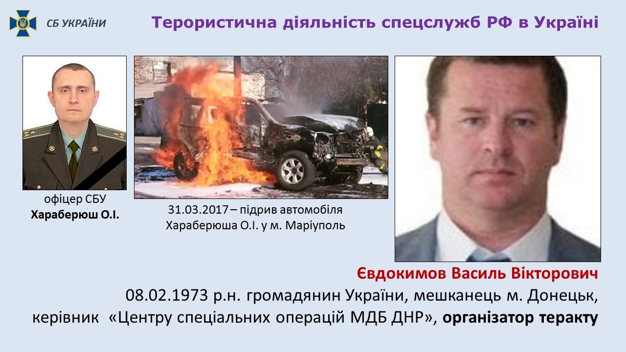 Он работает на некий «Центр специальных операций МДБ ДНР», который возглавляет Василий Евдокимов по прозвищу «Ленин».По данным Василия Грицака, именно этот человек устроил подрыв машины контрразведчика СБУ полкновника Александра Хараберюша в Мариуполе 31 марта 2017 года.