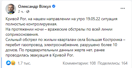 "Кривой Рог, на нашем направлении на утро 19.05.22 ситуация полностью контролируемая. На протяжении ночи – вражеские обстрелы по всей линии соприкосновения. Сильный обстрел по жилым кварталам села Большая Костромка – перебит газопровод, электроснабжение, разрушено более 10 домов. По предварительным данным, жертв нет, ранее проводилась эвакуация в Кривой Рог", - написал Александр Вилкул.