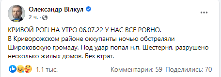"Под удар попал н. п. Шестерня, разрушено несколько жилых домов. Без потерь", - написал Александр Вилкул.