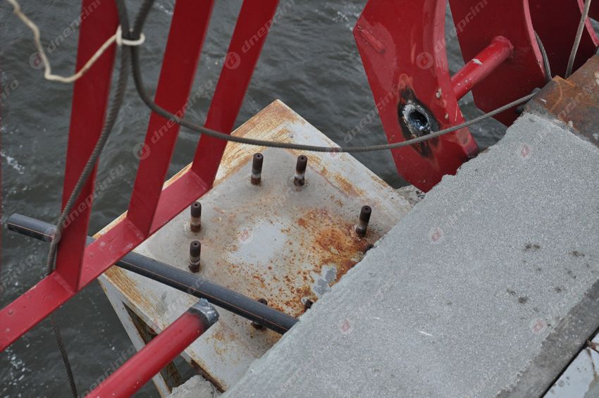 Кроме того, остальные балки "готовой" половины моста "лечат" не только с помощью навесных конструкций, свисающих с пешеходной части моста. Также нами была замечена 1 конструкция со строительными лесами, плавающая на воде.