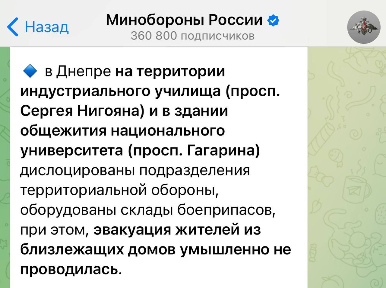 Уночі російське мінубивства знову заявило про те, що вони знайшли у гуртожитках Дніпра і коледжі у Кривому Розі військових і техніку.