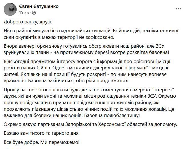 Тепер предметом інтересу ворога є інформація про орієнтовні місця роботи наших бійців. Одне з можливих джерел такої інформації - місцеві жителі. Як тільки наші позиції будуть розкриті - по ним нанесуть вогневе враження. Бавовна закінчиться, обстріли продовжаться. Прошу вас не обговорювати будь-де та не коментувати в мережі "Інтернет" звуки, які ви чули вночі, та можливі місця розташування техніки ЗСУ. Окремо прошу повідомляти в приватні повідомлення про жителів району, які проявляють підвищену цікавість до нічних подій та їх можливих локацій. Це важливо для безпеки наших воїнів! Бавовна полюбляє тишу! Окремо дякую партизанам Запорізької та Херсонської областей за допомогу. Бажаю вам тихого та гарного дня. Все буде добре. Ми переможемо! - написав голова Нікопольської військової адміністрації.