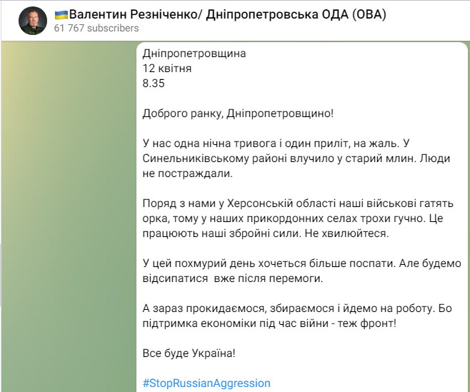 О том, какая ситуация в Днепропетровской области на утро 12 апреля, написал в своем Telegram-канале председатель областной военной администрации Валентин Резниченко.