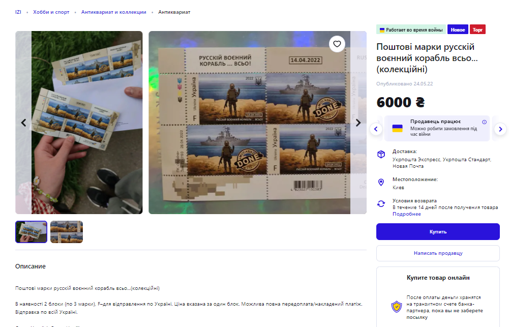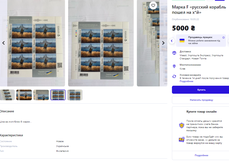 Так, за 12 марок под названием «Русский военный корабль…Всьо» предлагают заплатить 6,5 тыс грн. В объявлении сказано, что марки были куплены 23.05.