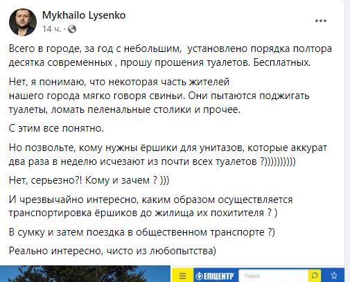 В городе есть примерно полтора десятка современных бесплатных туалетов. И они постоянно подвергаются погромам вандалов. Об этом на своей странице в Facebook рассказал заместитель мэра Михаил Лысенко.