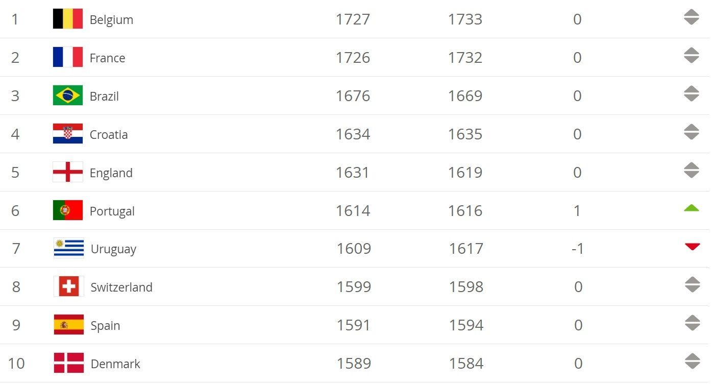 Как и раньше, возглавляет рейтинг Бельгия, следом идут Франция и Бразилия. Замыкают топ-5 Хорватия и Англия.