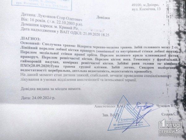 После Егора Лукьянова доставили в детскую областную больницу в Днепре. По словам отца, сейчас мальчик находится в коме. Врачи делают все возможное, чтобы спасти жизнь Егору. Также он рассказывает, что водитель, который сбил Егора, не помогает семье материально. На данный момент семья особенно нуждается в финансовой помощи на лечение.