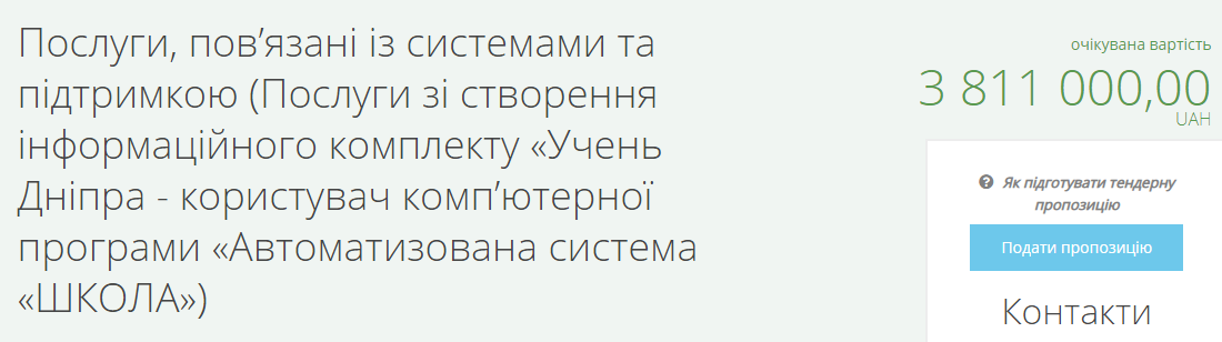 Соответствующий тендер был опубликован в системе электронных торгов «Prozorro». В нем говорится о приобретении услуг по созданию комплекта пользователя автоматизированной системы «Школа». В качестве заказчика указано коммунальное предприятие «Безопасное и инновационное образование» горсовета Днепра.
