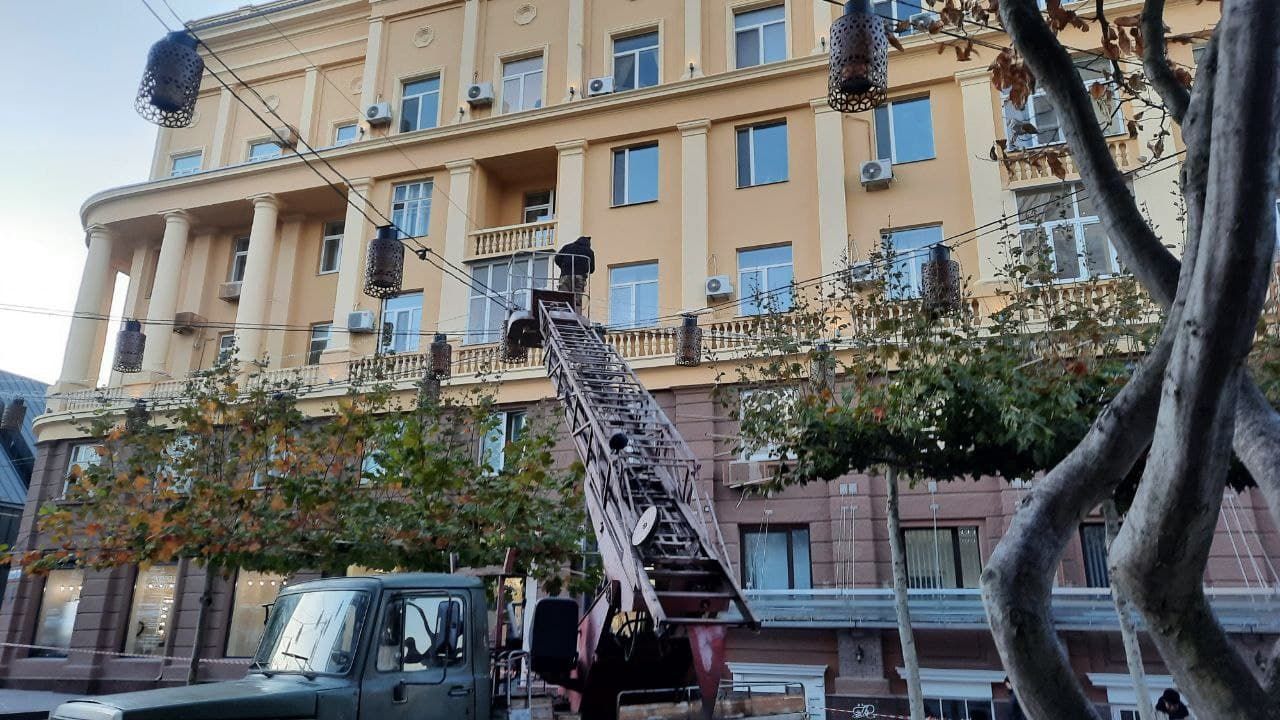 Работы идут полным ходом. Чтобы закрепить гирлянды сверху, коммунальщики используют автокран. Место работ оградили сигнальными лентами. Пешеходам можно пройти по левой стороне улицы, если идти от Пассажа. Успели уже развесить первые гирлянды. Сделают это вдоль всей улицы.