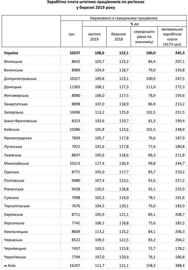 Средняя зарплата в Украине в марте 2019 года составила 10 237 гривен. В сравнении с мартом 2018 года – на 22,23%.