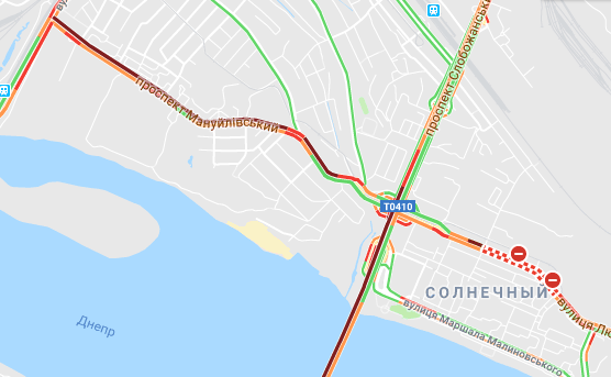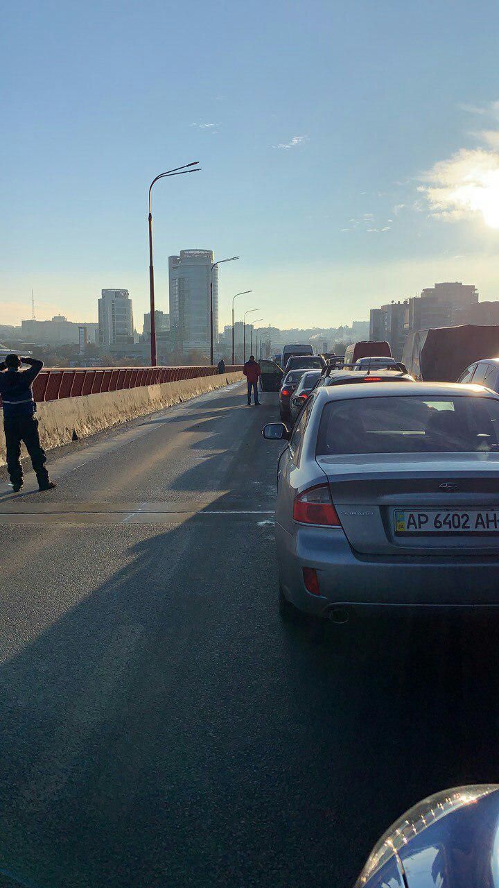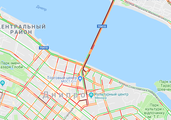 Из-за ДТП в пробках стоит не только мост, но и практически весь центр Днепра, Мануйловский проспект (бывший Воронцова), а также Слобожанский проспект (имени Газеты "Правда") аж до улицы Калиновой.