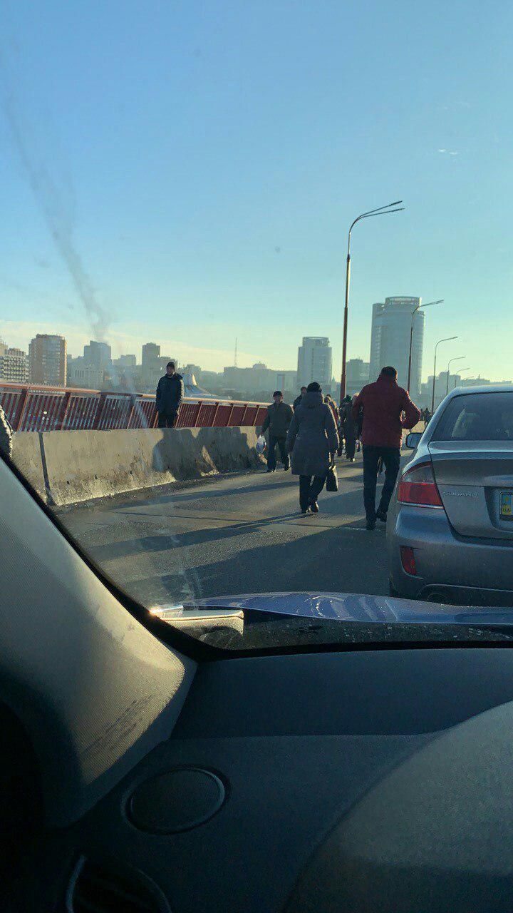 Как как авария заняла 2 полосы переправы, люди вынуждены выходить из общественного транспорта и идти пешком.