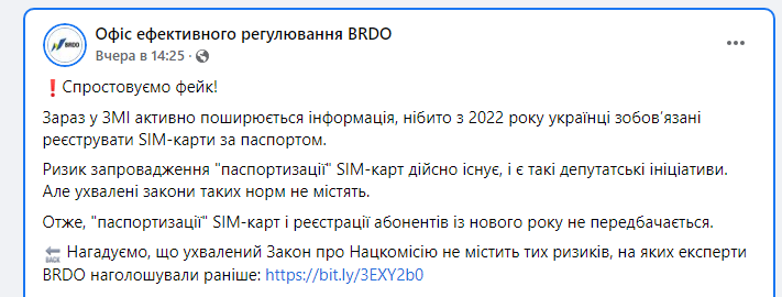 Представители офиса эффективной регулировки BRDO опровергли информацию о том, что украинцам нужно будет привязать паспортные данные к своей SIM-карте. Правда, там не исключают, что такой закон в будущем могут принять. Подобные депутатские инициативы были, но пока что паспортизации не будет.