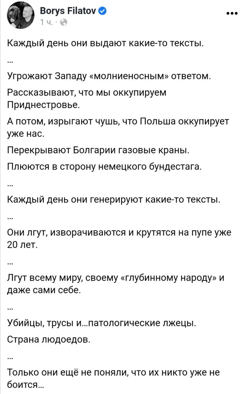 "Каждый день они выдают какие-то тексты. Угрожают Западу «молниеносным» ответом. Рассказывают, что мы оккупируем Приднестровье. А потом изрыгают чушь, что Польша оккупирует уже нас. Перекрывают Болгарии газовые краны. Плюются в сторону немецкого бундестага.