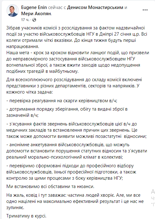 По его словам, вчера собралась комиссия, которая занимается расследованием резонансного убийства нацгвардейцев в Днепре. Туда входят представители разных департаментов, секторов и направлений. Сейчас правоохранителям необходимо пошагово воспроизвести цепочку событий, которые привели к трагедии. Правда, в этом им мешает коронавирус. Многие сотрудники заболели и не могут в полной мере помочь в расследовании.