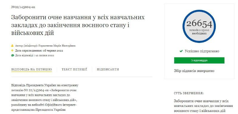 Отметим, петицию о запрете очного обучения во всех учебных заведениях до окончания военного положения и военных действий разместили на сайте 8 июня. Она быстро набрала более 26,6 тыс. подписей.