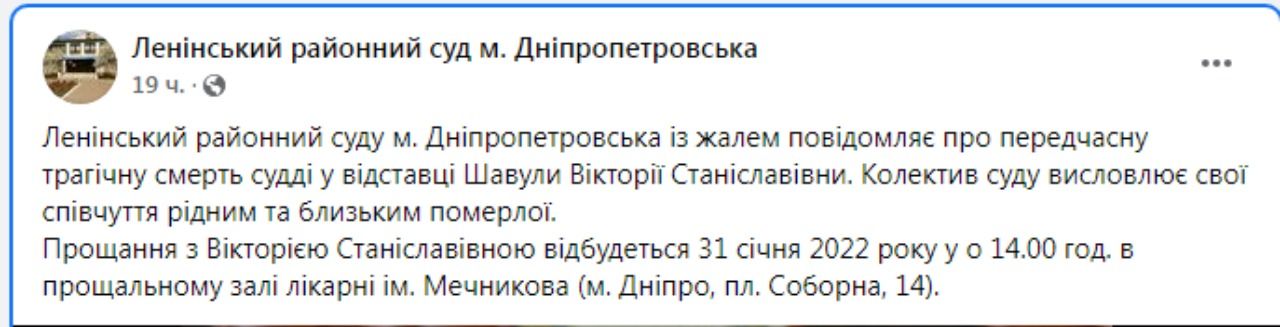 В Днепре умерла экс-судья Ленинского суда Шавула Виктория Станиславовна.