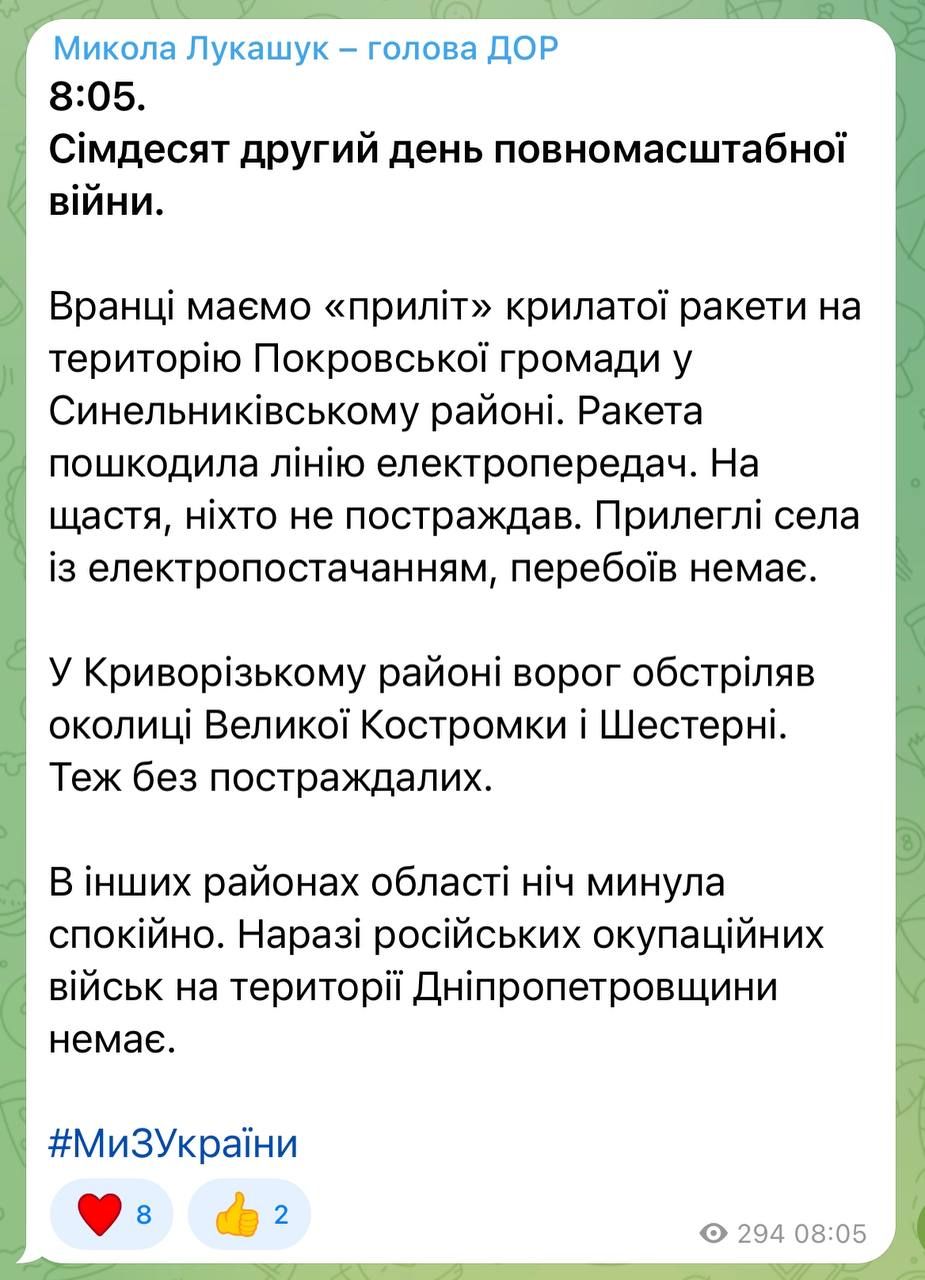 Из "Градов" оккупантами была обстреляна Зеленодольская и Широковская громады, стреляли по двум селам. К счастью, никто не пострадал.