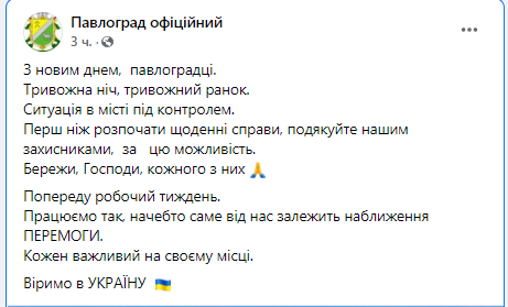 "С новым днем, павлоградцы. Тревожная ночь, тревожное утро. Ситуация в городе находится под контролем. Прежде чем начать ежедневные дела, поблагодарите наших защитников за эту возможность. Береги, Господи, каждого из них. Впереди рабочая неделя. Работаем так, будто именно от нас зависит приближение ПОБЕДЫ. Каждый важен на своем месте. Верим в Украину", - говорится в посте.