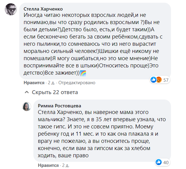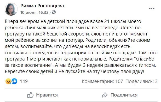 «На этой площадке есть специально отведенная территория для езды на велосипедах. Там того тротуара 1 метр и летают как ненормальные. Родителям «спасибо за такое воспитание». А мы будем 3 недели развлекаться с гипсом. Берегите своих детей и не пускайте на эту чертову площадку», - высказалась мать пострадавшей девочки.