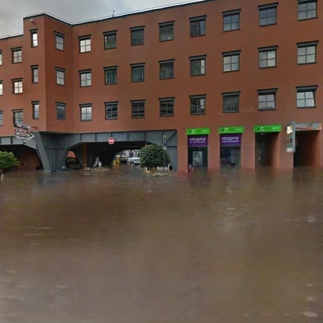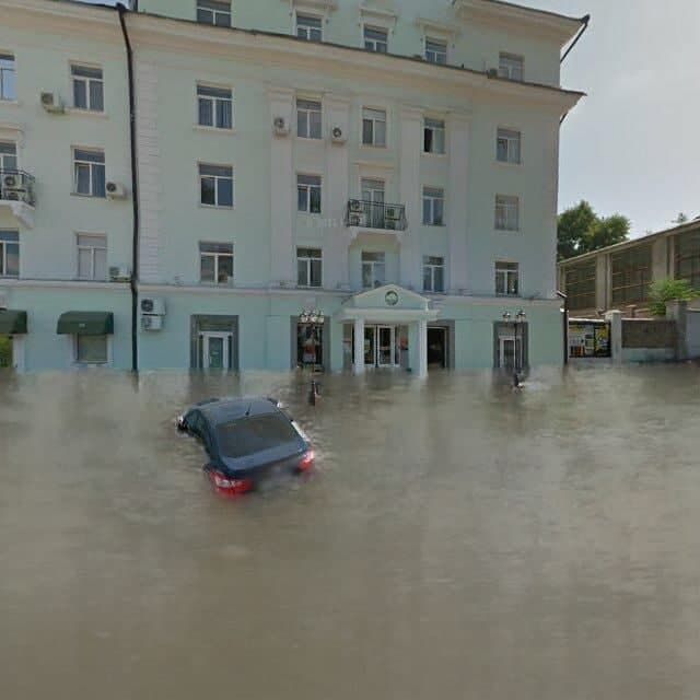 Менее правдоподобно выглядит потоп. Хотя машина, припаркованная рядом со зданием отлично вписалась в новый пейзаж.