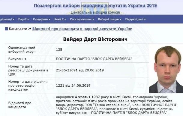 Центральная избирательная комиссия обнародовала реальное фото человека, который идет в парламент Украины под именем Дарта Вейдера, передает Бизнес Медиа.