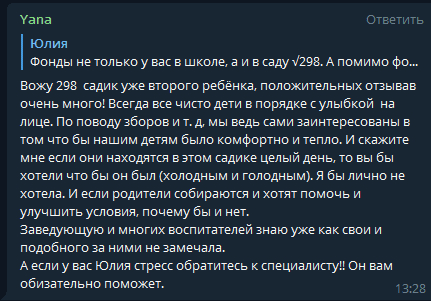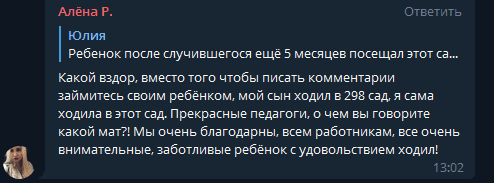 Но судя по чату другие родители никаких претензий к персоналу детского сада не имеют.