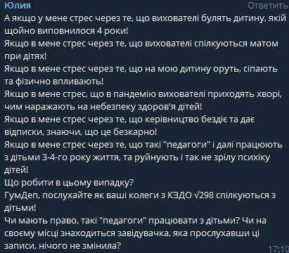 Подобный инцидент произошел еще в марте 2021 в детском саду №298, но в СМИ попал только теперь. На аудиозаписи, которую обеспокоенная мама опубликовала только сейчас в комментариях к одному из постов Департамента гумполитики Днепровского горсовета, слышно, как воспитатели не подбирая слов грубо обращаются с детьми. Женщина говорила такие фразы: