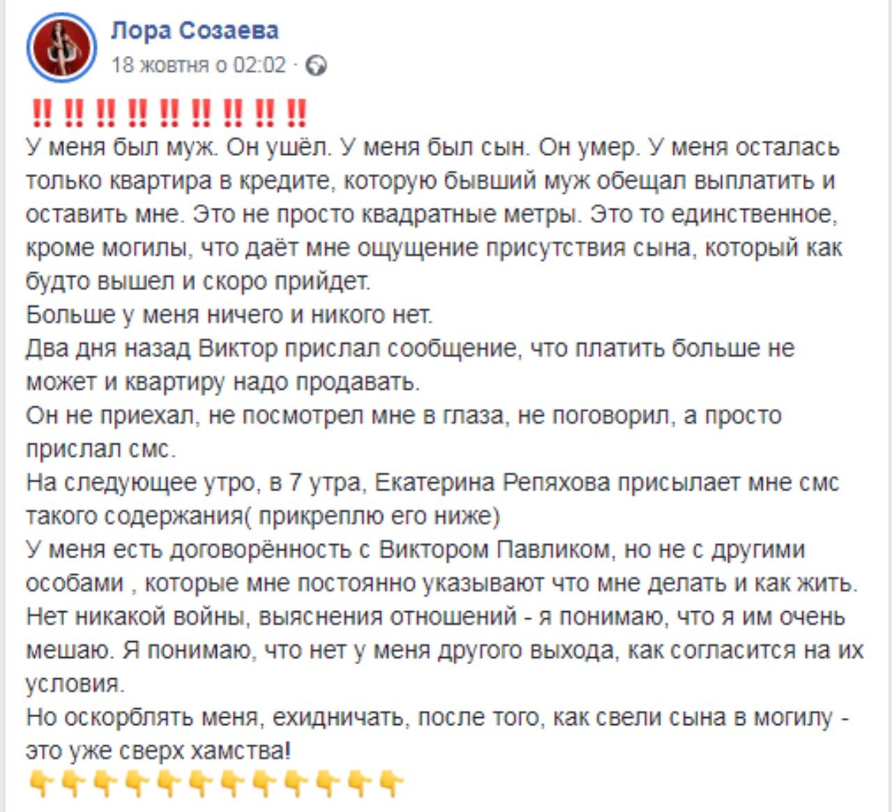 «У меня был муж. Он ушел. У меня был сын. Он умер. У меня осталась лишь квартира в кредите, который бывший муж обещал выплатить и оставить мне. Это не просто квадратные метры. Это то единственное, кроме могилы, что дает мне ощущение присутствия сына, который будто вышел и скоро придет. Больше у меня ничего да никого нет. Два дня назад Виктор прислал мне сообщение, что платить больше не может и квартиру нужно продавать. Он не приехал, не посмотрел мне в глаза, не поговорил, а просто прислал смс», - написала Созаева.