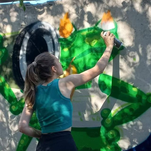Малює не тільки жабок, а й інших тварин. До прикладу, на житловому масиві Південний, вона намалювала мурал з крокодилом.