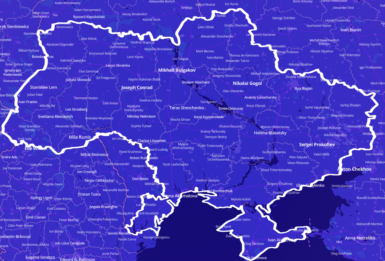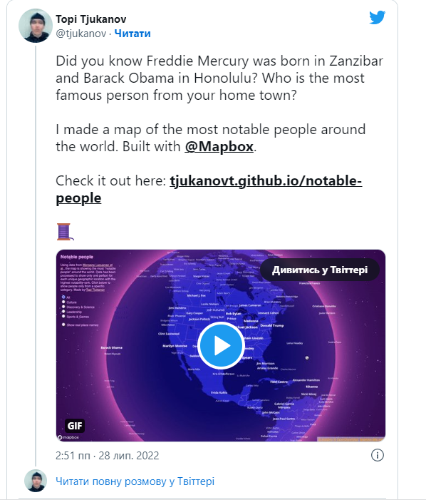 Географ із Гельсінкі та старший дизайнер карт у Mapbox Топі Тюканов створив інтерактивну карту світу, на якій відзначені місця, де народилися "найвідоміші люди".