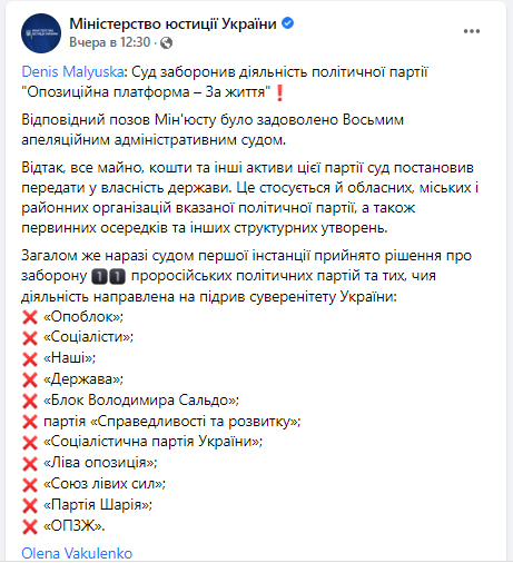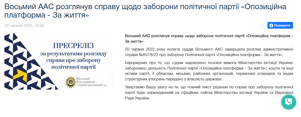 В понедельник, 20 июня, Восьмой апелляционный административный суд во Львове принял решение запретить деятельность политической партии «Оппозиционная платформа – За жизнь».
