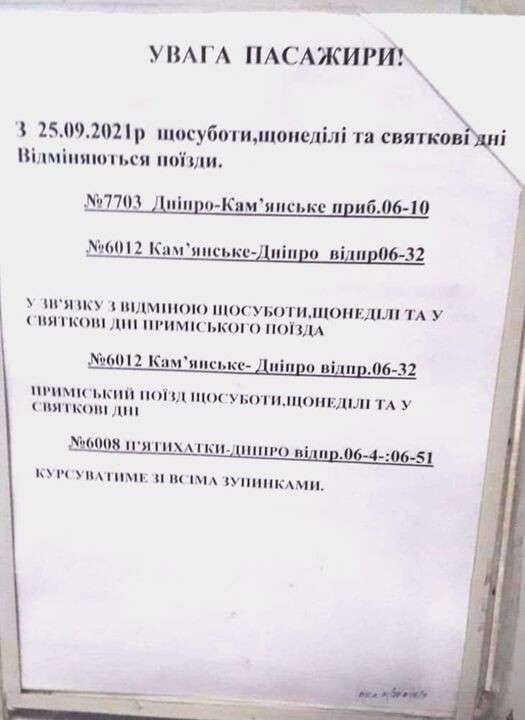 В связи с отменой поезда No 6012 Каменское - Днепр (отправление 06:32) в эти дни (выходные и праздники) поезд No 6008 Пятихатки - Днепр будет курсировать со всеми остановками. Будьте внимательны, так как есть некоторые изменения.
