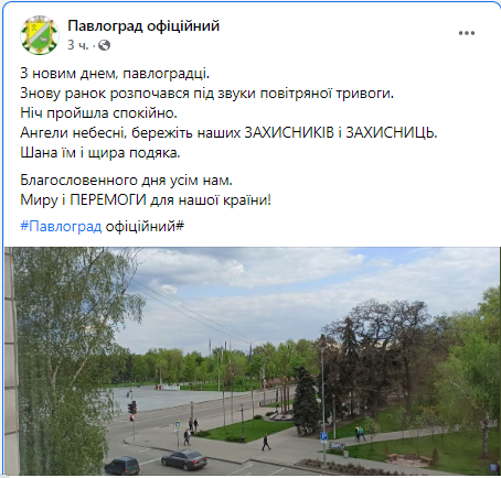 "С новым днем, павлоградцы. Снова утро началось под звуки воздушной тревоги. Ночь прошла спокойно. Ангелы небесные, берегите наших защитников и защитниц. Почет им и искренняя благодарность. Благословенного дня всем нам. Мира и Победы для нашей страны!" - говорится в сообщении.