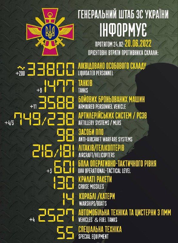 Общие боевые потери противника с 24.02 по 20.06 ориентировочно составили: