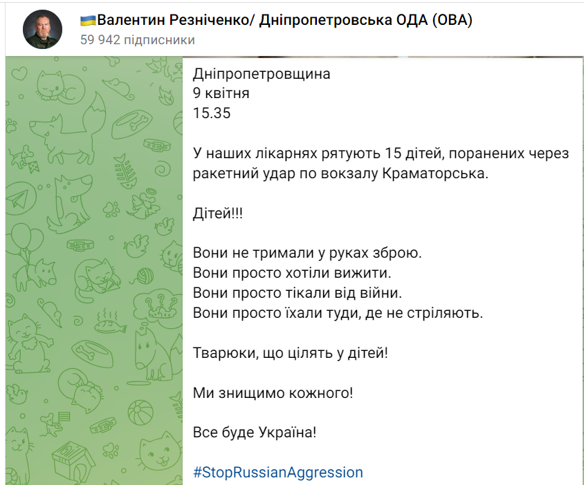 "В наших больницах спасают 15 детей, раненых из-за ракетного удара по вокзалу Краматорска. Детей!!! Они не держали в руках оружие. Они просто хотели выжить. Они просто убегали от войны. Они просто хотели уехать туда, где не стреляют. Твари, которые целят у детей! Мы уничтожим каждого! Все будет Украина!" - написал Валентин Резниченко.
