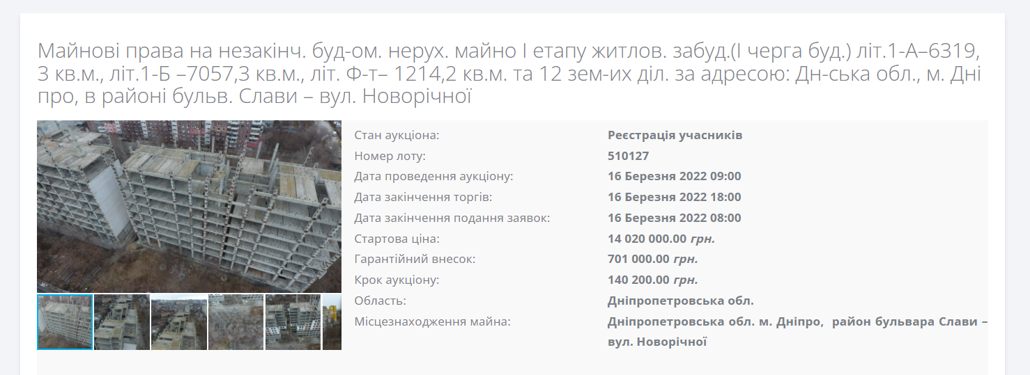 Первый дом готов на 22%, а второй на 24%. Аукцион должны провести 16 марта, начальная цена - 14 млн гривен. Сообщается, что ЖК принадлежит ТОВ «Правильная компания», имущество которого арестовала Государственная исполнительная служба за долги по ипотечному договору от 2009 года, с запретом на отчуждение. Новому владельцу ЖК надо будет довести стройку до конца.