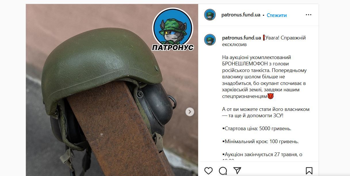 Стартовая цена на аукционе 5 тысяч гривен, повышать ставки можно на 100 гривен. В комментариях уже есть несколько желающих приобрести трофейный шлем. Вырученные деньги волонтеры потратят, чтобы закрыть нужды "Азова", а также 25 и 93 бригад.
