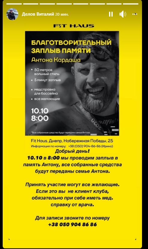 В Днепре устроят благотворительный заплыв памяти Антона Кардаша. Основная цель - собрать средства для его семьи.